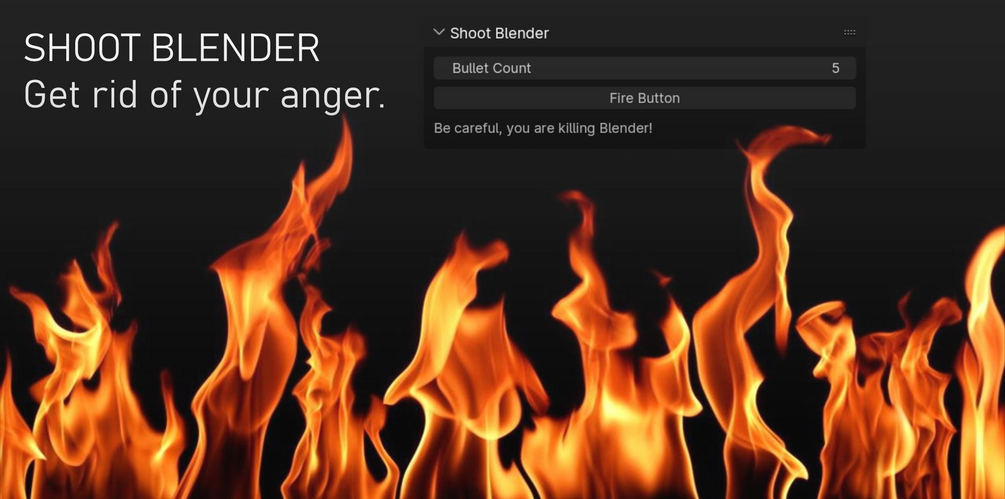 Installs a button and bullet counter in blender. When you can't handle your emotions: set the amount of bullets and fire them at blender. Be careful! If you shoot too many bullets, blender will die.